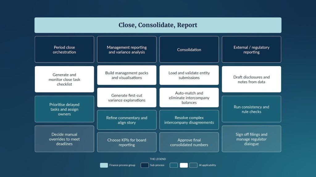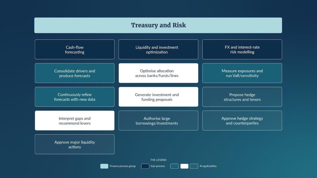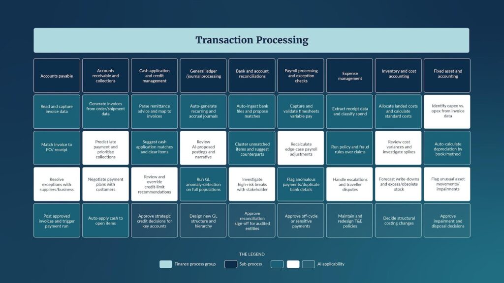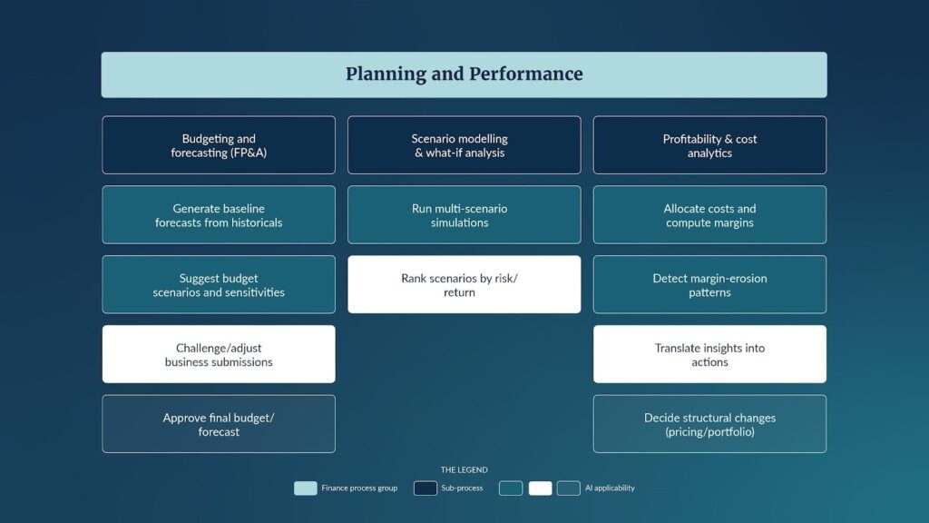 We shared tables showing the applicability of AI across key finance processes and sub-processes. In certain areas, it can be used confidently; in a few others, it passively supports decisions; and in others, human oversight is essential.