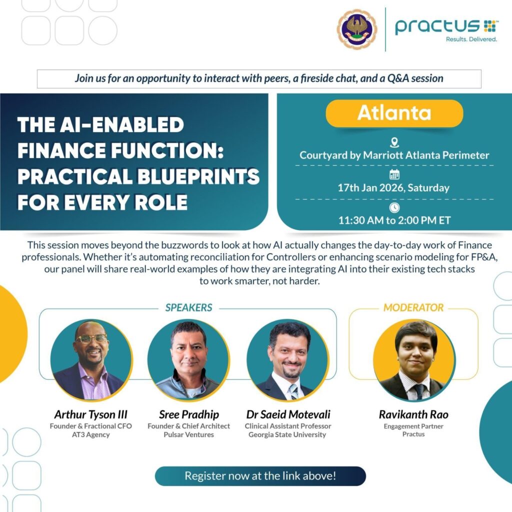 In a recent discussion on how AI is moving beyond slide decks into real-world use cases, Ravikanth Rao, Managing Partner at Practus, sat down with a panel of industry experts to hear their views on the tech stacks, ROI, and human skills that are driving this transition. The panel consisted of Dr. Saeid Motevali, Clinical Assistant Professor at Georgia University; Sree Pradhip, Founder and Chief Architect at Pulsar Ventures; and Arthur Tyson III, Founder and Fractional CFO at AT3 Agency.